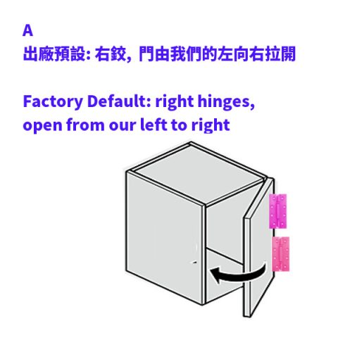 門鉸位署: 一般出廠預設右鉸左開 (即我們面對酒柜, 鉸在我們的右手邊, 門由我們的左向右拉開)